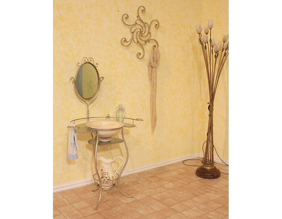 Lavello da camera con ripiano d'appoggio e porta asciugamano , completo di specchiera ovale regolabile.