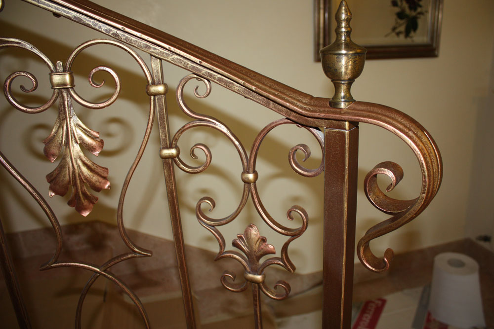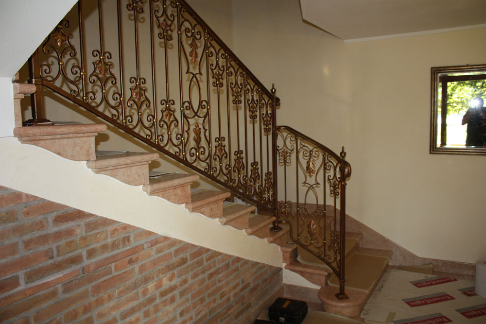 Ringhiera per scala interna in ferro battuto lavorato in stile con decori a riccioli, interamente realizzato in ferro pieno con riccioli forgiati e foglie sbalzate a mano, costruito con tecniche di lavorazioni antiche, quali il metodo della chiodatura e dell'incastro per unire i ferri che compongono la ringhiera.