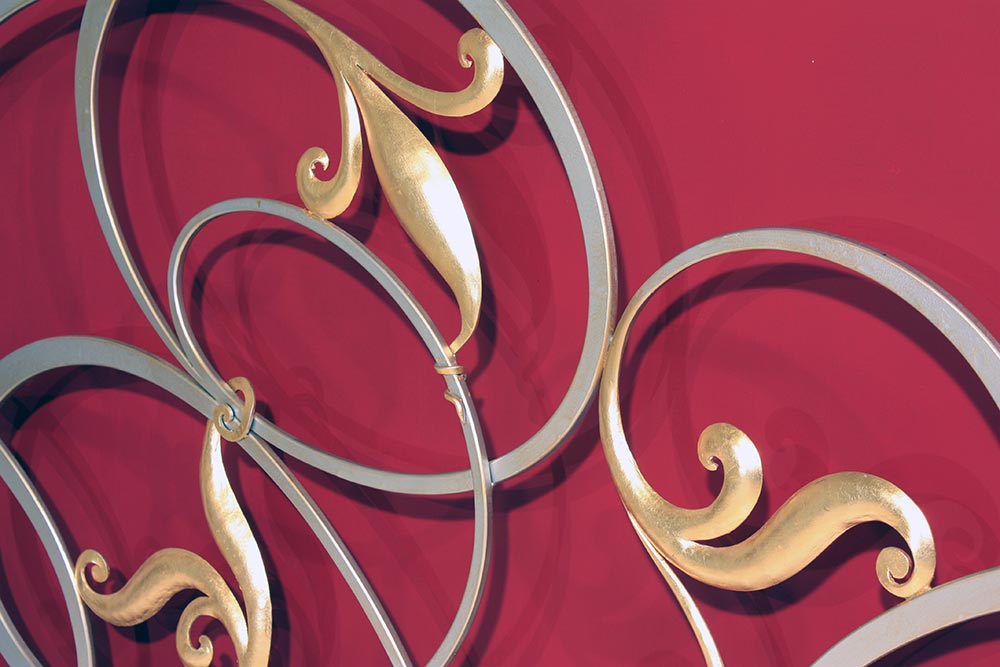 verniciatura argento cromo, impreziosito da particolari in foglia oro invecchiati.