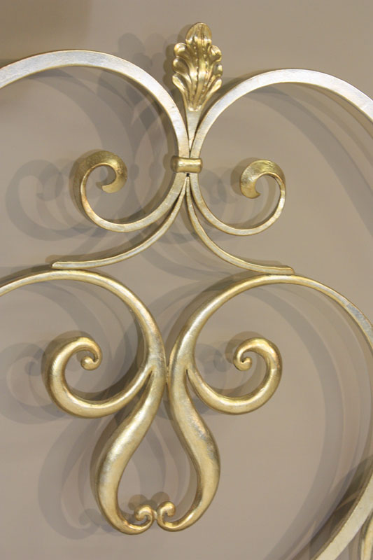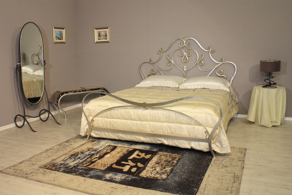 Letto a due piazze lavorato tutto in ferro pieno forgiato a mano con terminali riccioli forgiati a foglia.