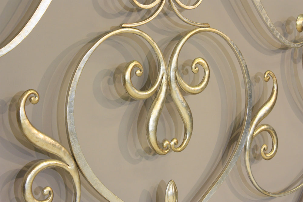 Verniciatura foglia argento invecchiata, impreziosito da particolari sfumati in oro antico.