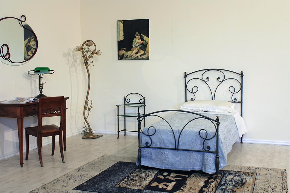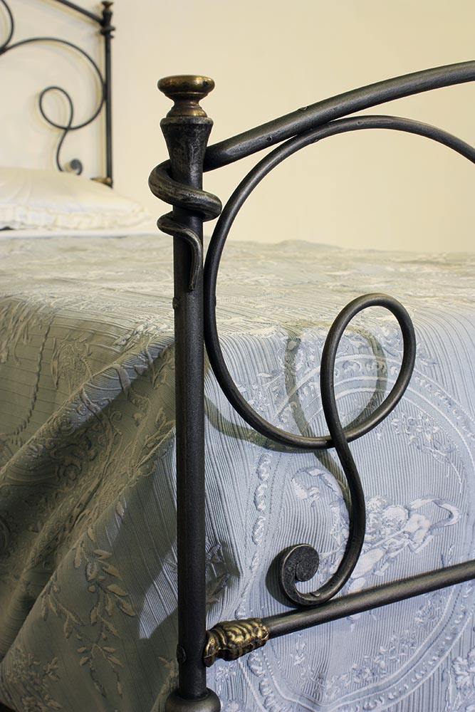 Letto a una piazza lavorato tutto in ferro pieno tondo forgiato a mano, INTERAMENTE CHIODATO A MANO SECONDO LE ANTICHE TECNICHE con decori a volute, verniciatura ferro naturale con pomelli e piedini in ottone invecchiato.