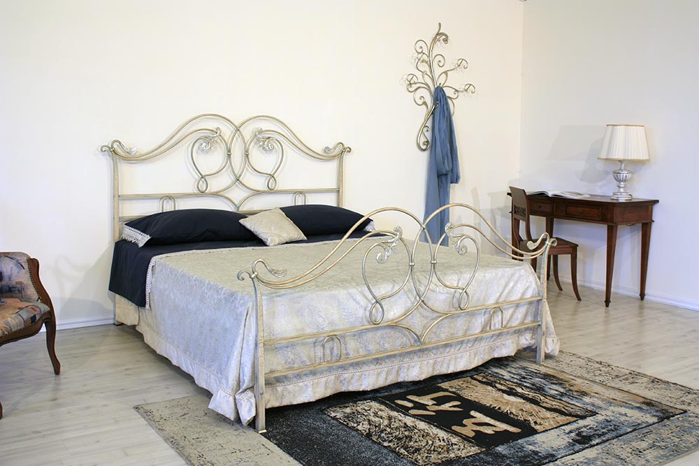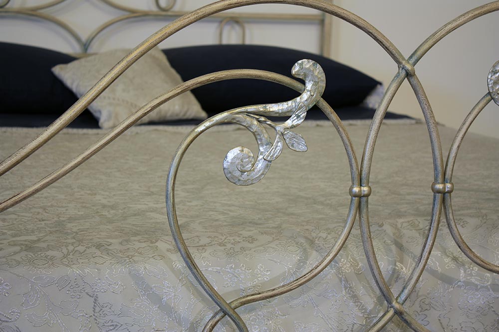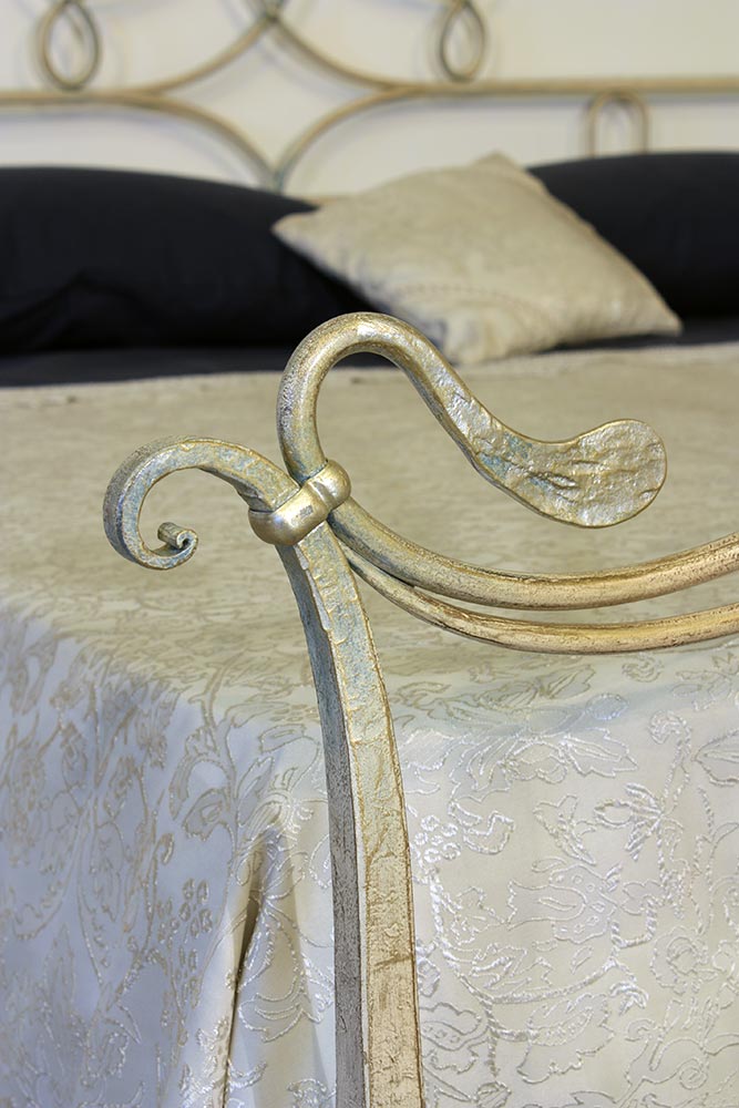 Letto a 2 piazze lavorato tutto in ferro pieno tondo forgiato a mano con decori a volute con giglio centrale e foglie laterali battute a mano, verniciatura avorio patinato oro impreziosito da particolari in foglia.