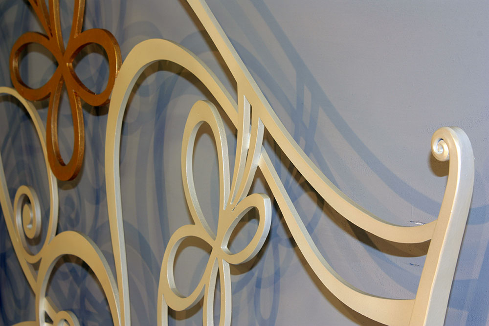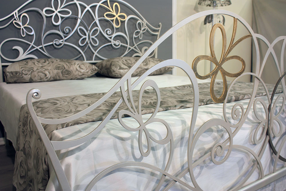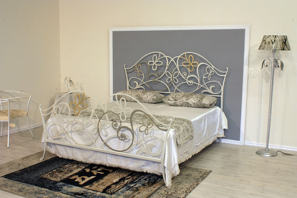 Letto a 2 piazze lavorato tutto in ferro piatto pieno a sezioni variabili forgiato a mano con decori a volute, verniciatura avorio perla impreziosito da particolari in foglia oro.
