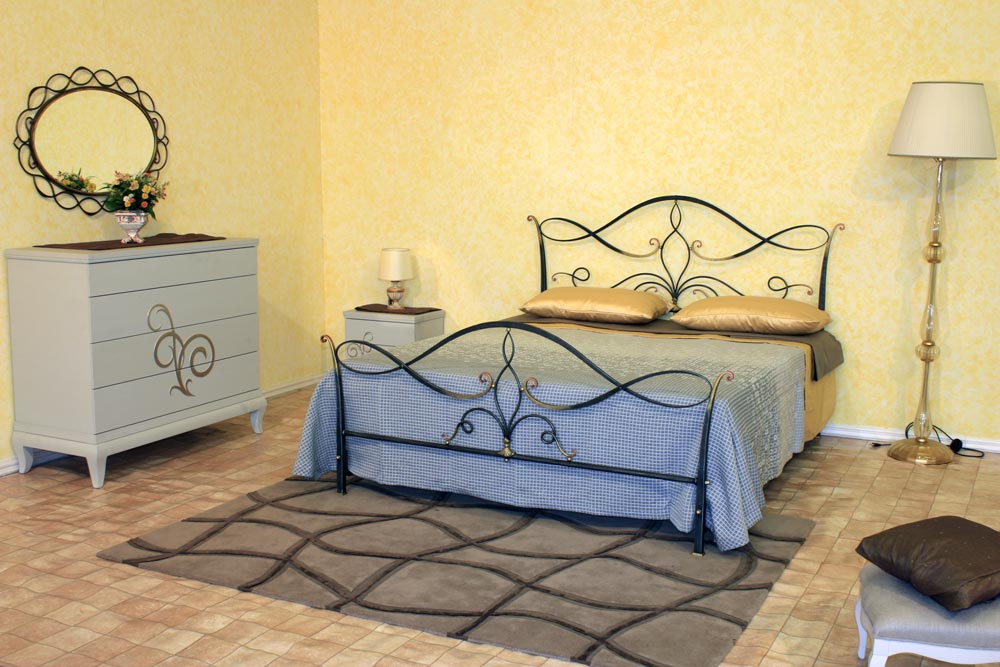 Letto matrimoniale lavorato tutto in ferro pieno con telaio in ferro quadro e piatto, interno lavorato in ferro tondo forgiato a mano con decori a volute, verniciatura ferro naturale impreziosito da particolari sfumati in rame e oro.