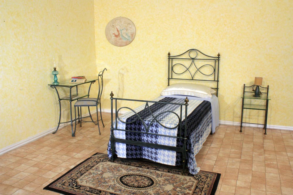 Letto a 1 piazza lavorato tutto in ferro pieno tondo forgiato a mano, INTERAMENTE CHIODATO A MANO SECONDO LE ANTICHE TECNICHE con decori a volute, verniciatura BLU GHIACCIO con pomelli e piedini in ottone invecchiato.