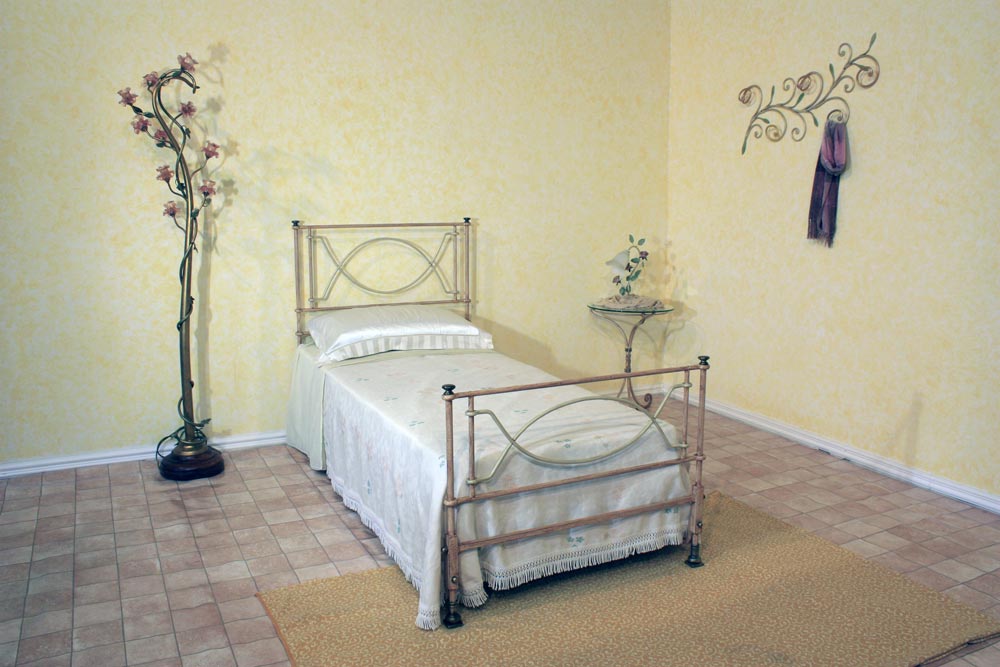 Letto singolo lavorato tutto in ferro pieno tondo forgiato a mano, INTERAMENTE CHIODATO A MANO SECONDO LE ANTICHE TECNICHE con decori a volute, verniciatura avorio patinato ocra con la parte centrale avorio anticato oro. Pomelli e piedini in ottone invecchiato