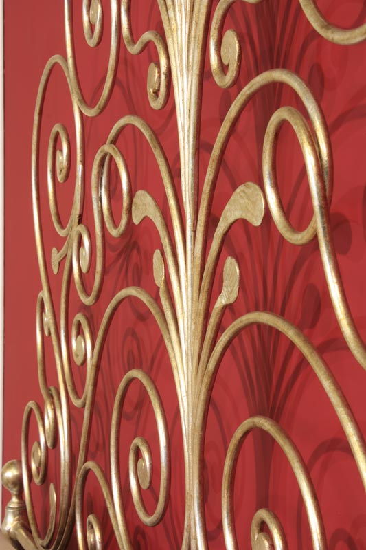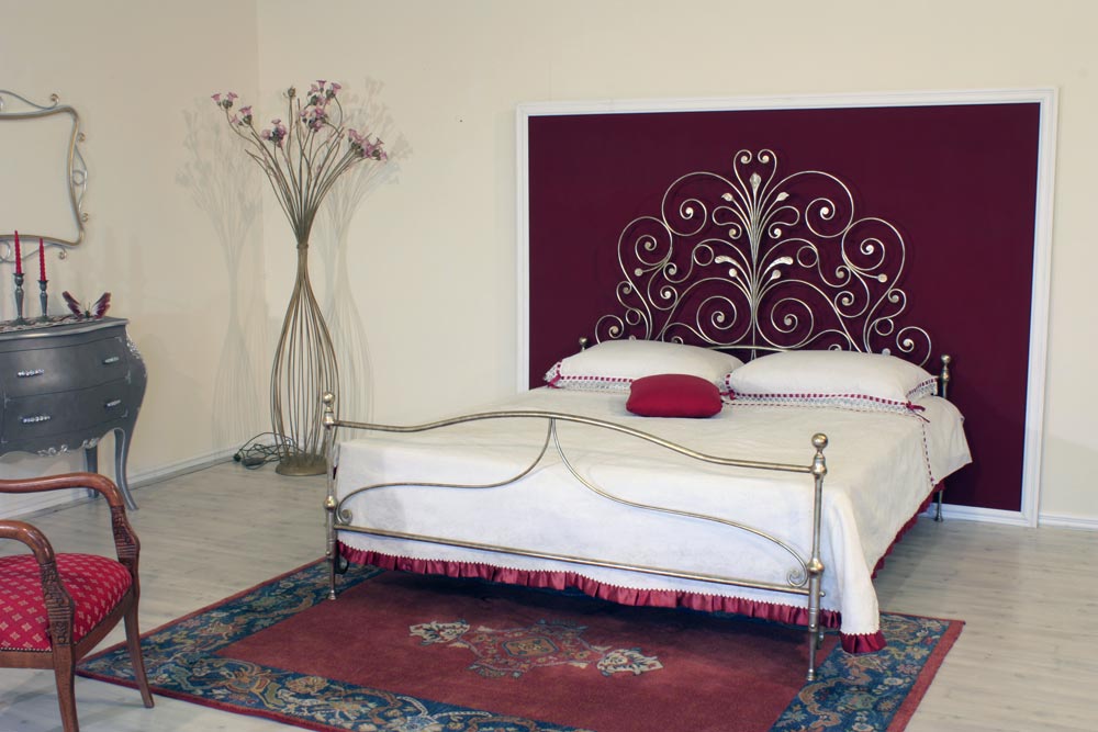 Letto lavorato tutto in ferro pieno tondo forgiato a mano, con decori a volute , verniciatura foglia argento mecca.