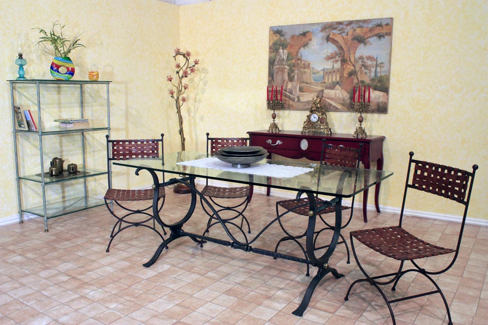 Tavolo da pranzo in ferro battuto forgiato a mano con ripiano in cristallo